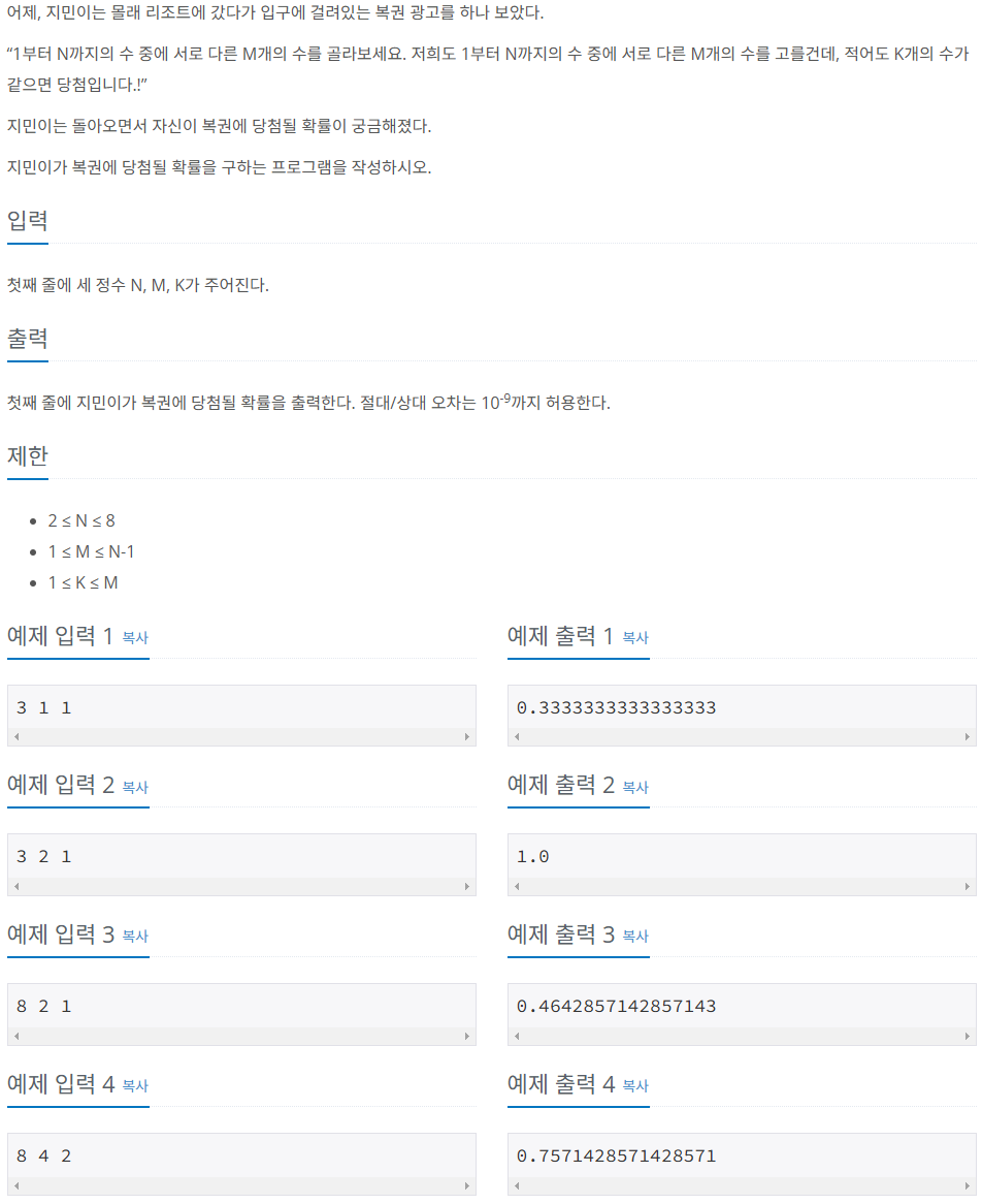 print(lottery_probability(n, m, k))