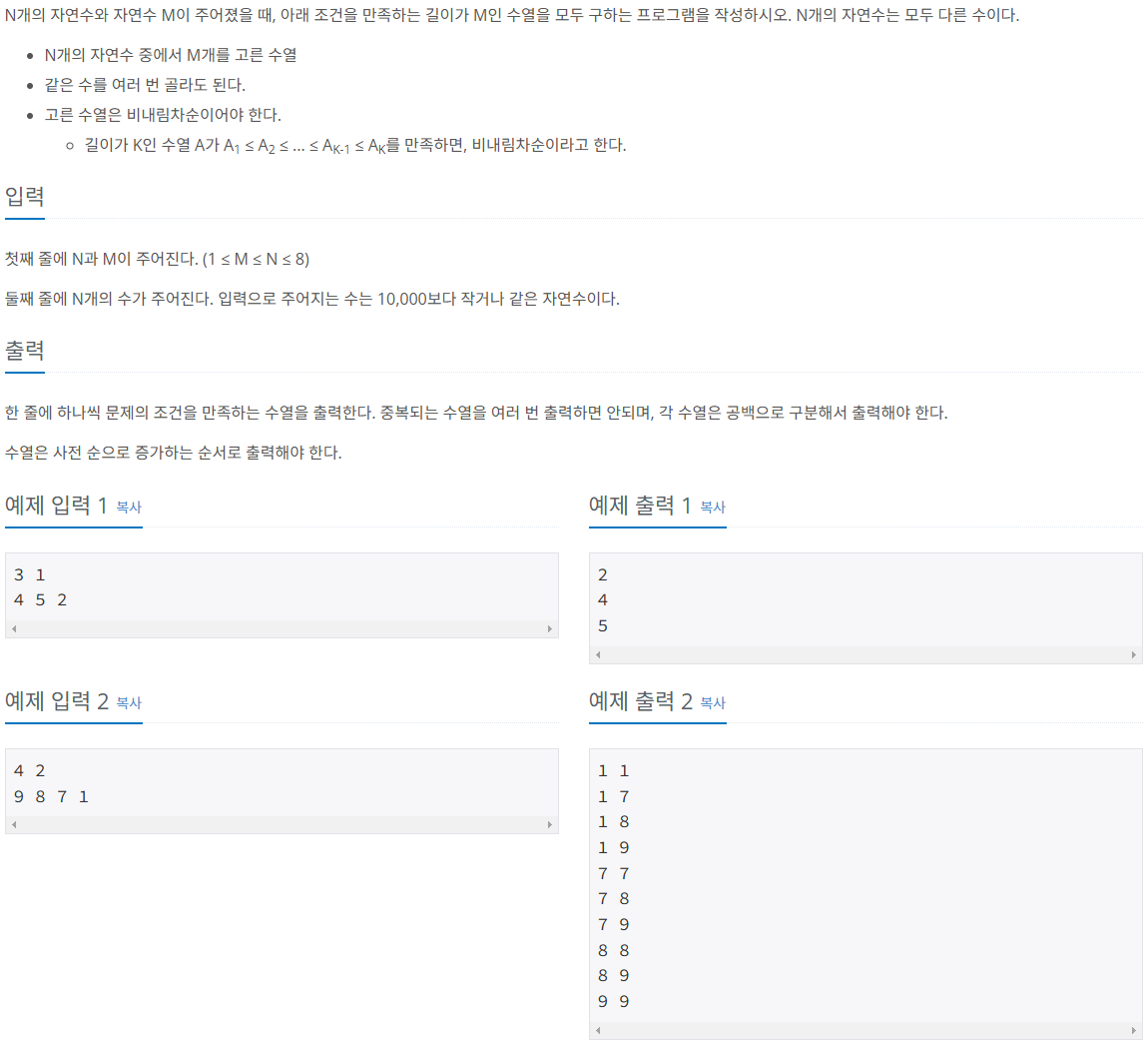 문제 제목: N과 M (8) / 15657번 (실버 3단계)