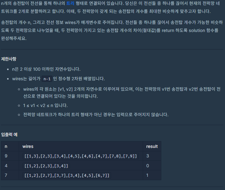 문제 제목: 전력망을 둘로 나누기 (2단계)