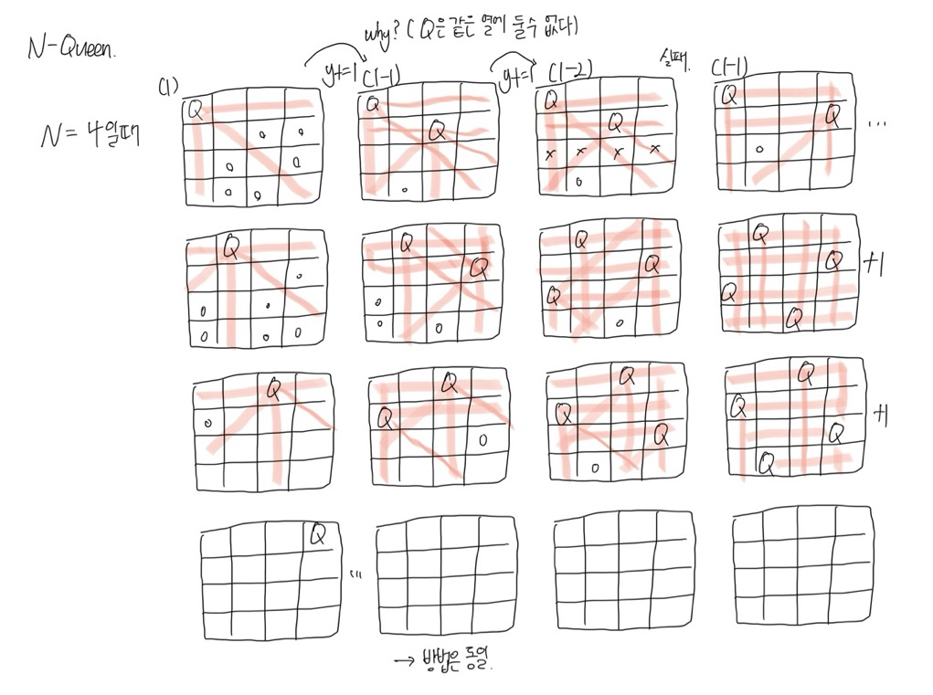 NxN 배열을 생성해서 0은 빈 상태 1은 퀸을 둔상태로 하나씩 두기 시작합니다! 퀸을 두었을 때 퀸이 다른 퀸으로부터 위협을 받는지 확인하고 두게 됩니다!