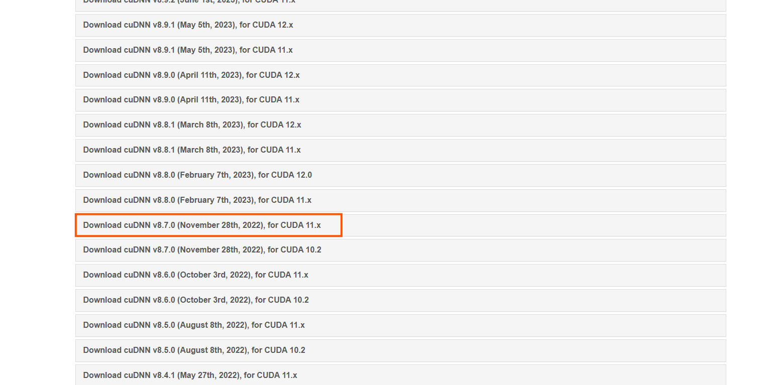 아래 링크에서 CUDA 11.8과 호환되는 cuDNN 8.7.0을 다운로드를 하겠습니다! 이때 NVIDIA 웹사이트 계정이 있어야 다운로드가 가능합니다.
