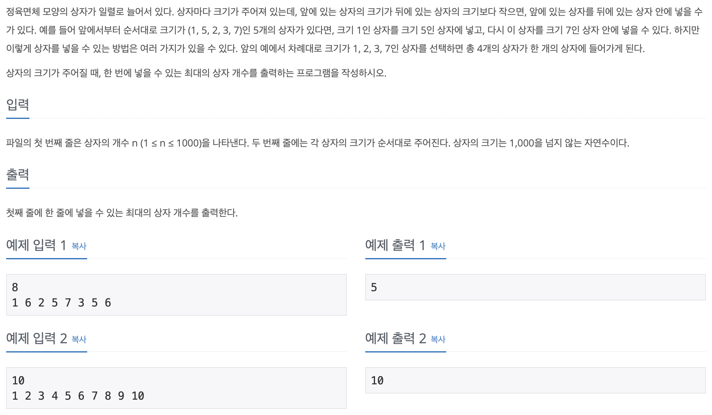 # dp[i]: boxs[i]를 마지막으로 사용하는 가장 긴 증가 부분 수열의 길이