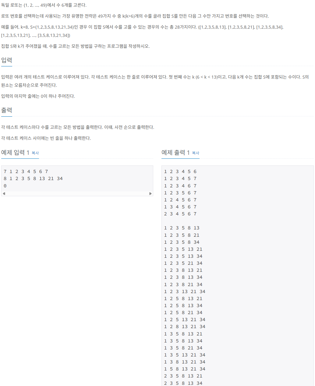 문제 사이트: https://www.acmicpc.net/problem/6603