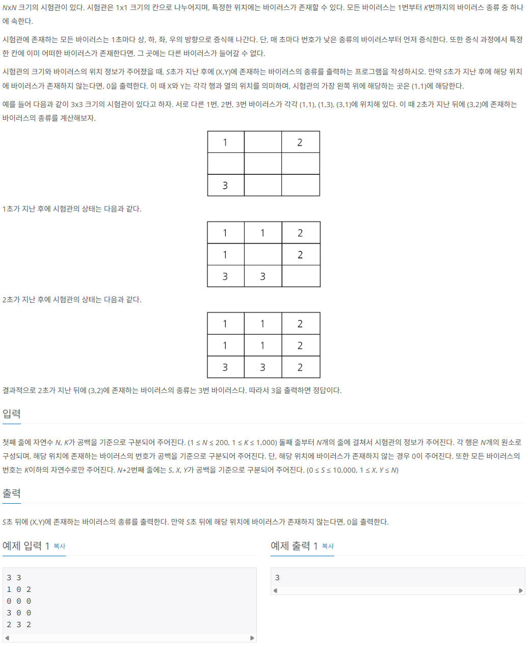 아래의 코드는 시간 초과한 코드입니다. 매 초마다 모든 바이러스를 탐지해서 다시 뿌리는 작업은 시간복잡도 측면에서 오래 걸리는 문제가 발생했습니다.