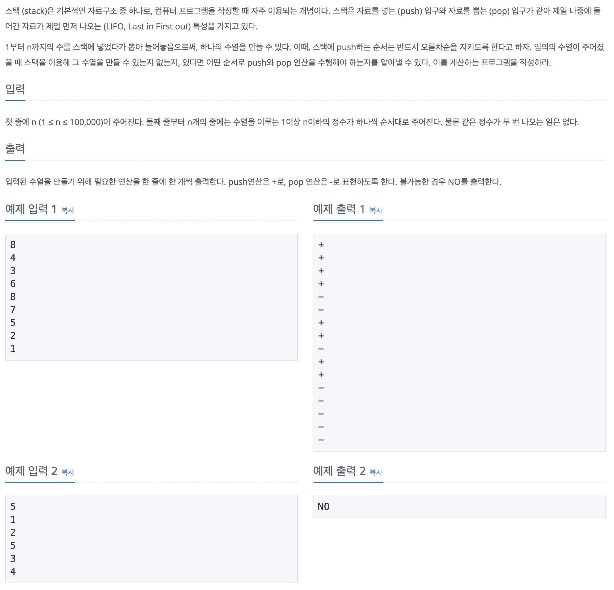 문제 제목: 스택 수열 / 1874번 (실버 2단계)