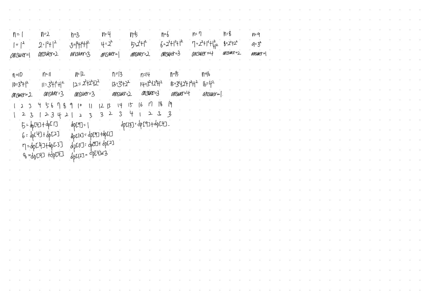 dp[i] = min(dp[i], dp[i - j * j] + 1)