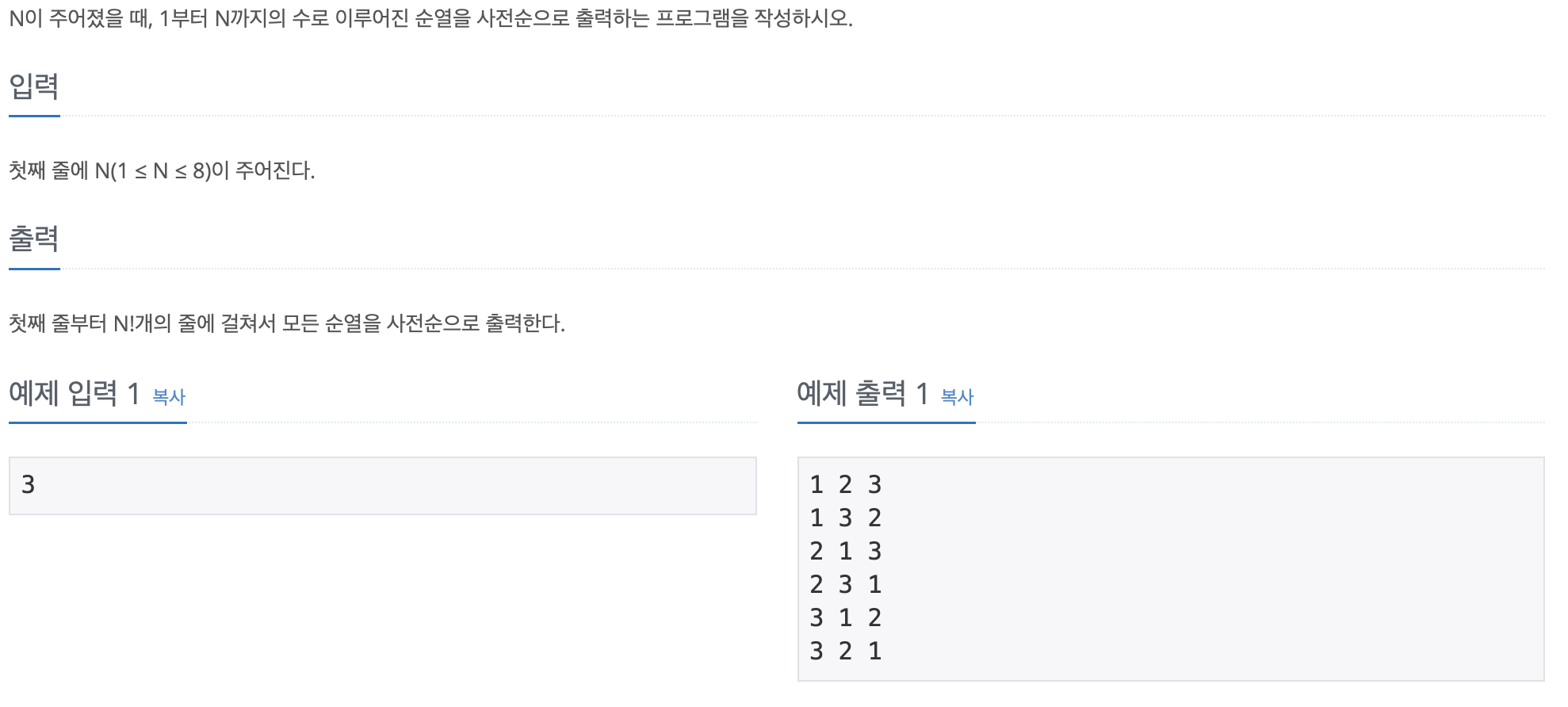 문제 제목: 모든 순열 / 10974번 (실버 3단계)