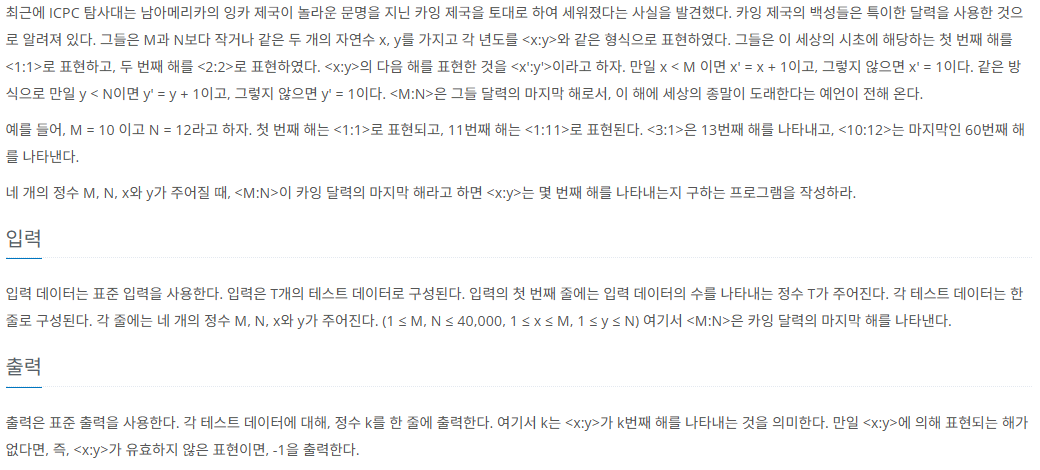 문제 제목: 카잉 달력 / 6064번 (실버 1단계)