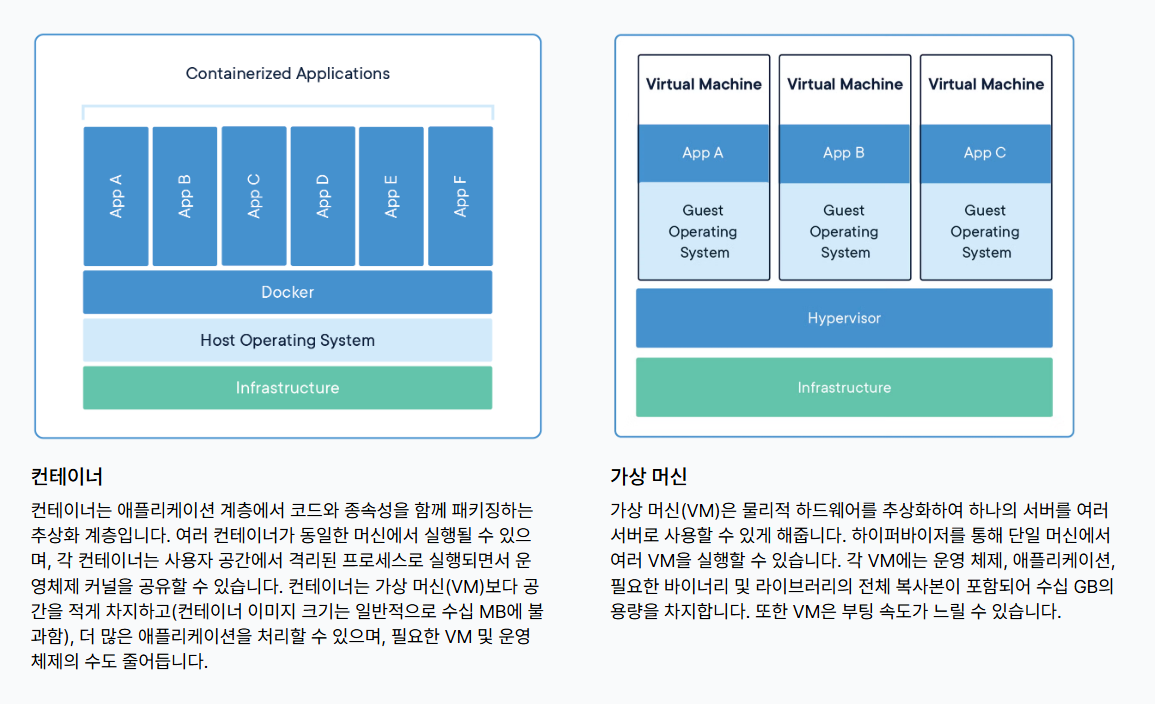 | 무게 | 무거움 (GB 단위, 전체 OS 포함) | 가벼움 (MB 단위, 애플리케이션만 포함) |